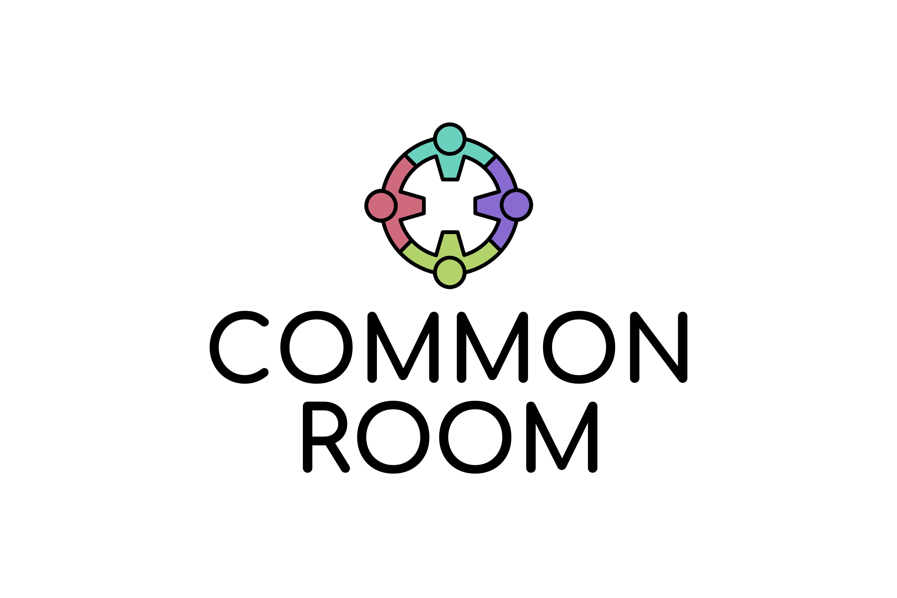 At the centre of the identity is a circular logo mark formed from individual figures coming together to create a unified focal point. Each element represents a member of the community, reinforcing the idea that Common Room is built on collective effort rather than individual isolation.